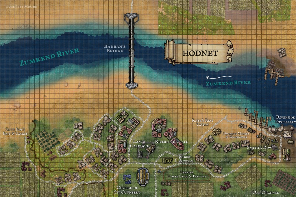 Hodnet straddles a bend of the Zumkend River, its stone docks, warehouses, and timber palisade projecting stability on the frontier. Once a fortified village, Hodnet now supports trade, militia, and politics, making it the second-most important settlement in Wolfsward after Rutherton. The River Riders’ Lance ensures raids are repelled, while smugglers, cultists, and spies seek to undermine its growing influence.