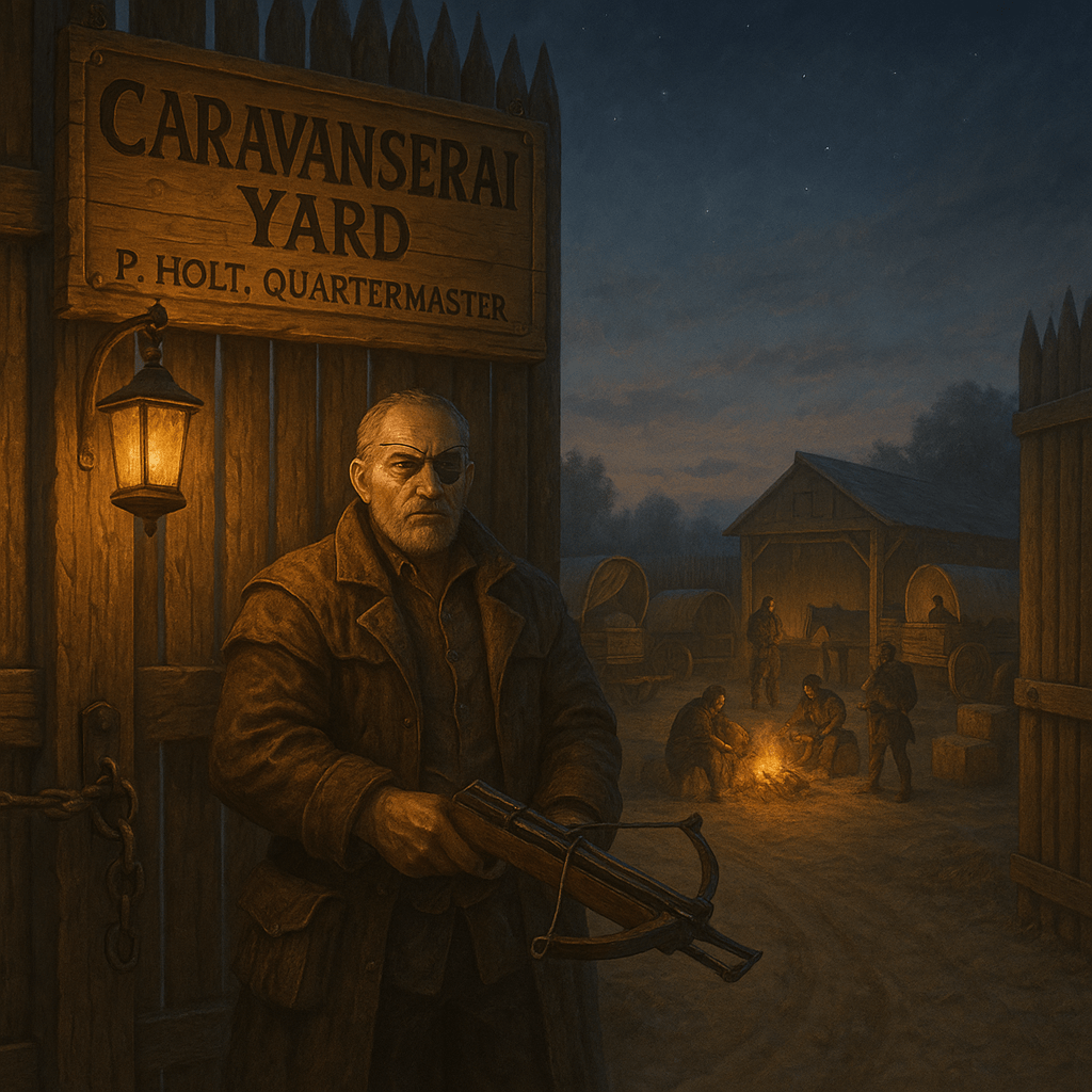 A fenced wagon lot run by Perrin Holt, a one-eyed mercenary turned quartermaster. The yard can hold a dozen wagons and has a small stable for caravan horses. Perrin is blunt but fair, and keeps a loaded crossbow near the gate.