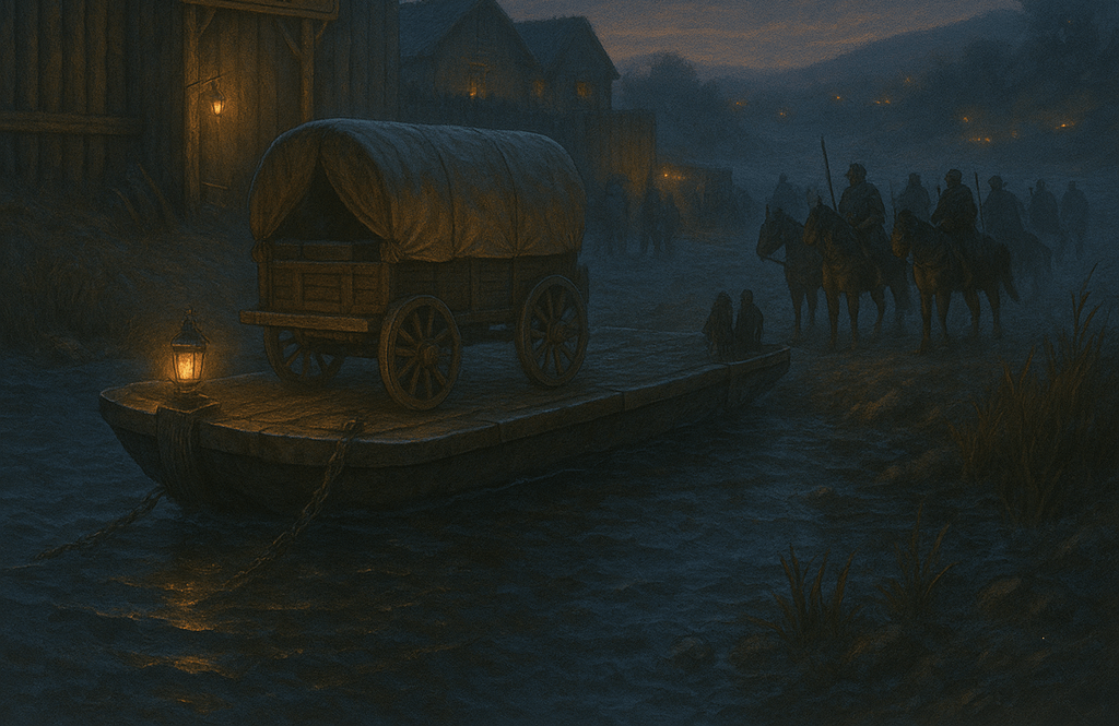 The ferry itself is a broad, flat-bottomed barge, big enough to take two wagons or a dozen mounted riders. It is lashed to the bank by thick, tarred chains when not in use — a precaution against barbarian raids and spring floods alike. Westwatch’s people live with one eye always westward, where the Grosskopf clans roam the hills. Trade and raiding blur together here: caravan guards share drinks with suspicious locals, and smuggled goods sometimes change hands as quickly as tolls are paid.