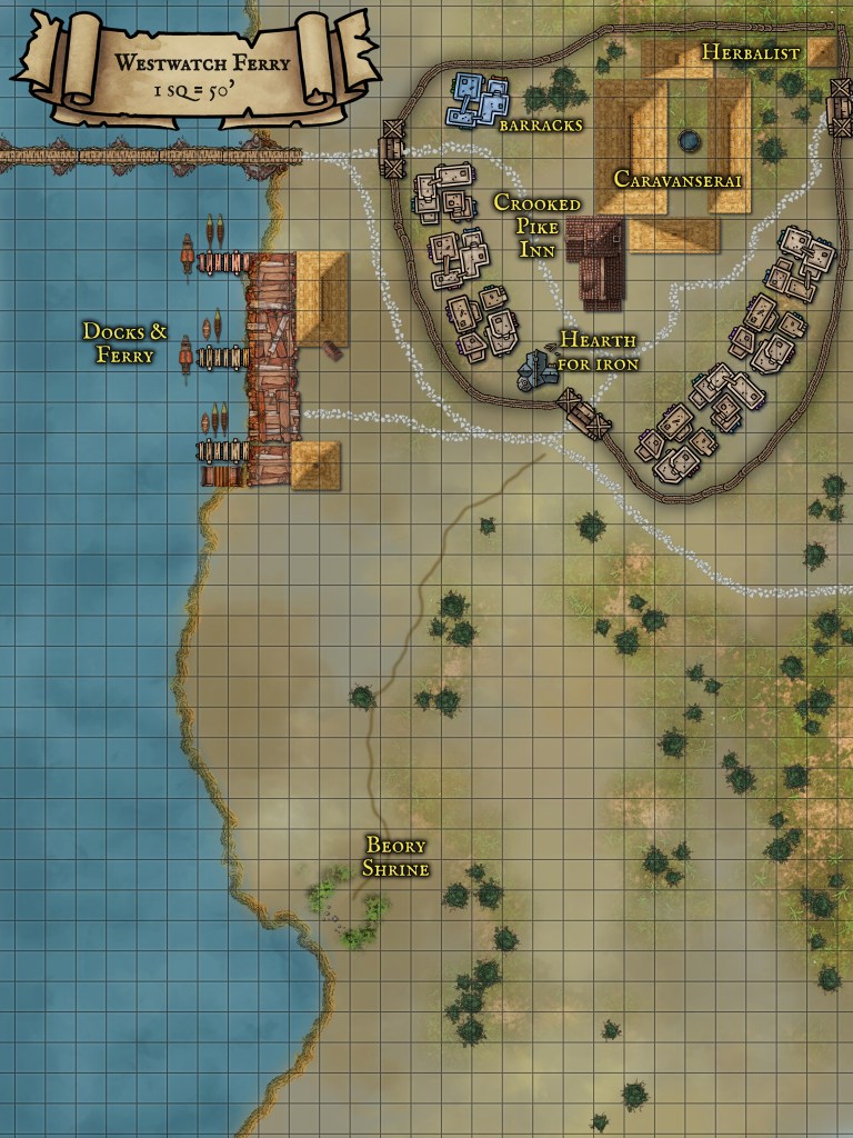 Westwatch Ferry is a hard-bitten frontier hamlet of about 110 souls, built where the east–west trade road bends south toward Hodnet and crosses the Zumker River. The entire settlement is enclosed by a stout timber palisade braced with rough-hewn logs, and three gated guardhouses secure entrance to the community. One guardhouse overlooks the ferry dock and manned by 5-6 guards with longbows, crossbows, and a ballista crew. The small trade bridge spanning the Zumker approximately 1000′ across. Its stone pillars built centuries before and the bridge has endured conflicts but being only 25′ across and open, it is not ideal for mass crossings by armies, easily defended, and primarily used by caravans and merchants.