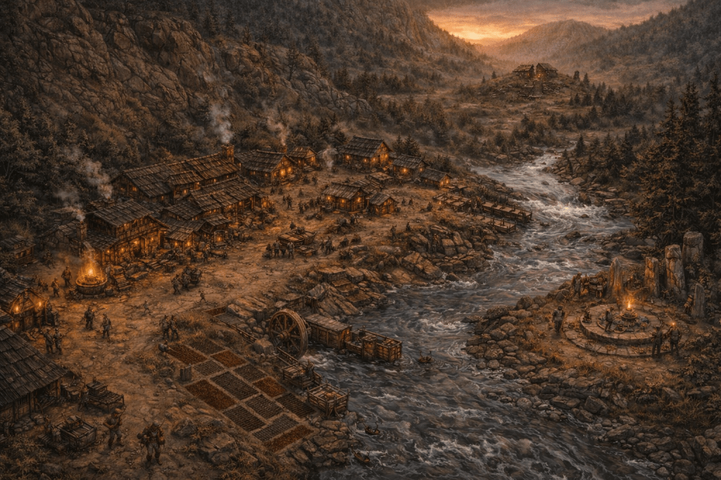 - Atmosphere: The air smells faintly metallic and damp. The hills glow rust-red at dusk. Evenings are quiet but for the rhythmic ring of picks and the low moan of the wind through the river gorges. Locals tend to be terse, slow to trust, and wary of outsiders.