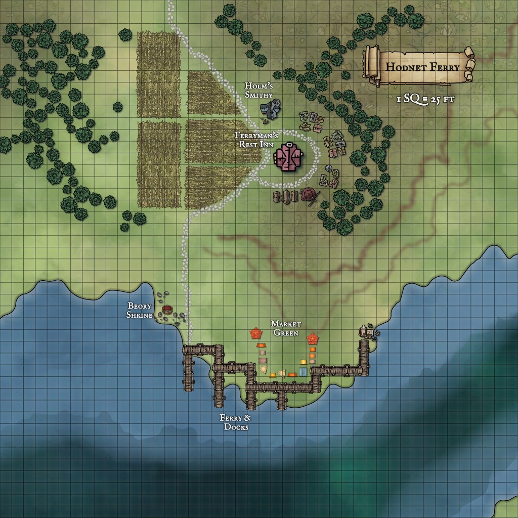 The ferry itself is a stout barge lashed to heavy ropes, capable of taking ox-carts and wagons across the river. Raiders occasionally test the hamlet, but the locals are used to defending themselves with polearms and hunting bows.