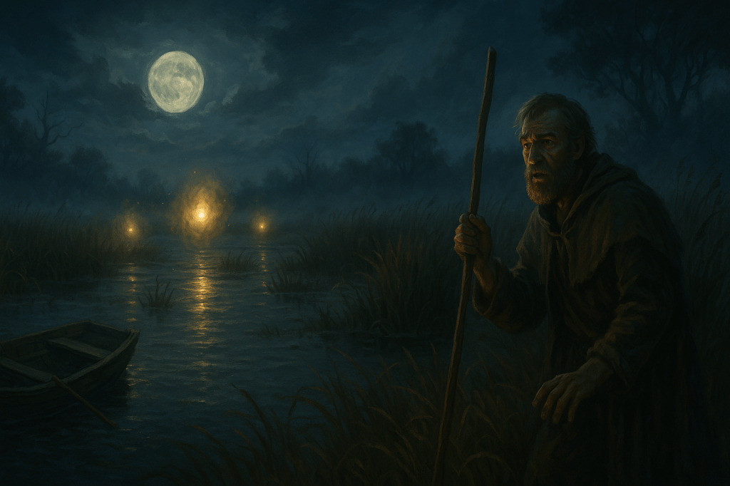 Tonight, Talric Fenmoor — his face pale and hands trembling — points to the reedy isles just east of town. “There! You see them, don’t you? Flickering, swaying… they want you to follow. They want you drowned.” The air smells faintly of rot and river-mist, and the silence between the croaks of frogs feels far too deep.