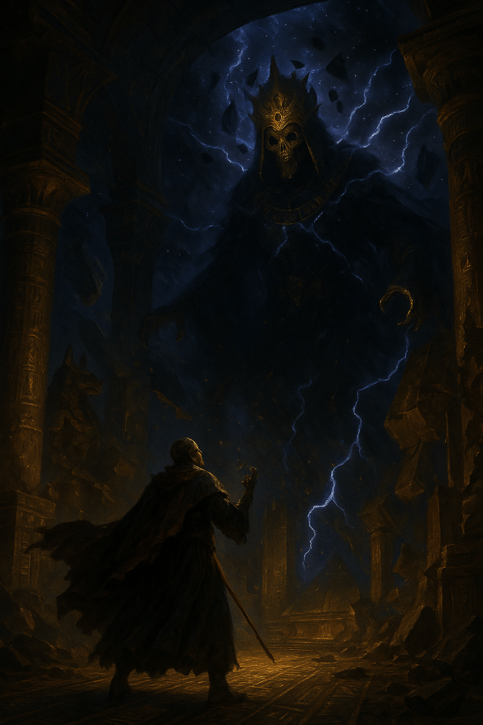 The implications of this second telling of the Veyth Heresy are troubling beyond measure. For if it is true, then Kas is not dead, but hidden — kept in the folds of shadow as one keeps a dagger under one’s cloak, to be drawn again should the Tyrant rise. What price he paid for such a bargain none can say, but one shudders to think it. Was he remade? Was his soul stripped and reforged in the black fires of the Plane? Perhaps annihilation would have been the greater mercy. For if Kas yet walks, then when he is called again, we may not recognize him — save by the ruin that follows.